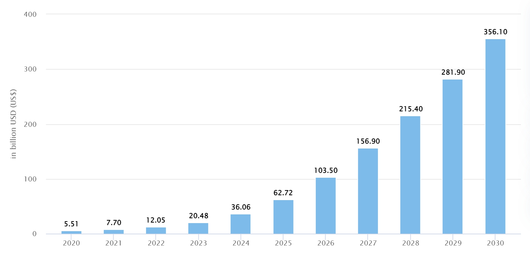 Global generative AI market growth. Source:https://www.statista.com/outlook/tmo/artificial-intelligence/generative-ai/worldwide